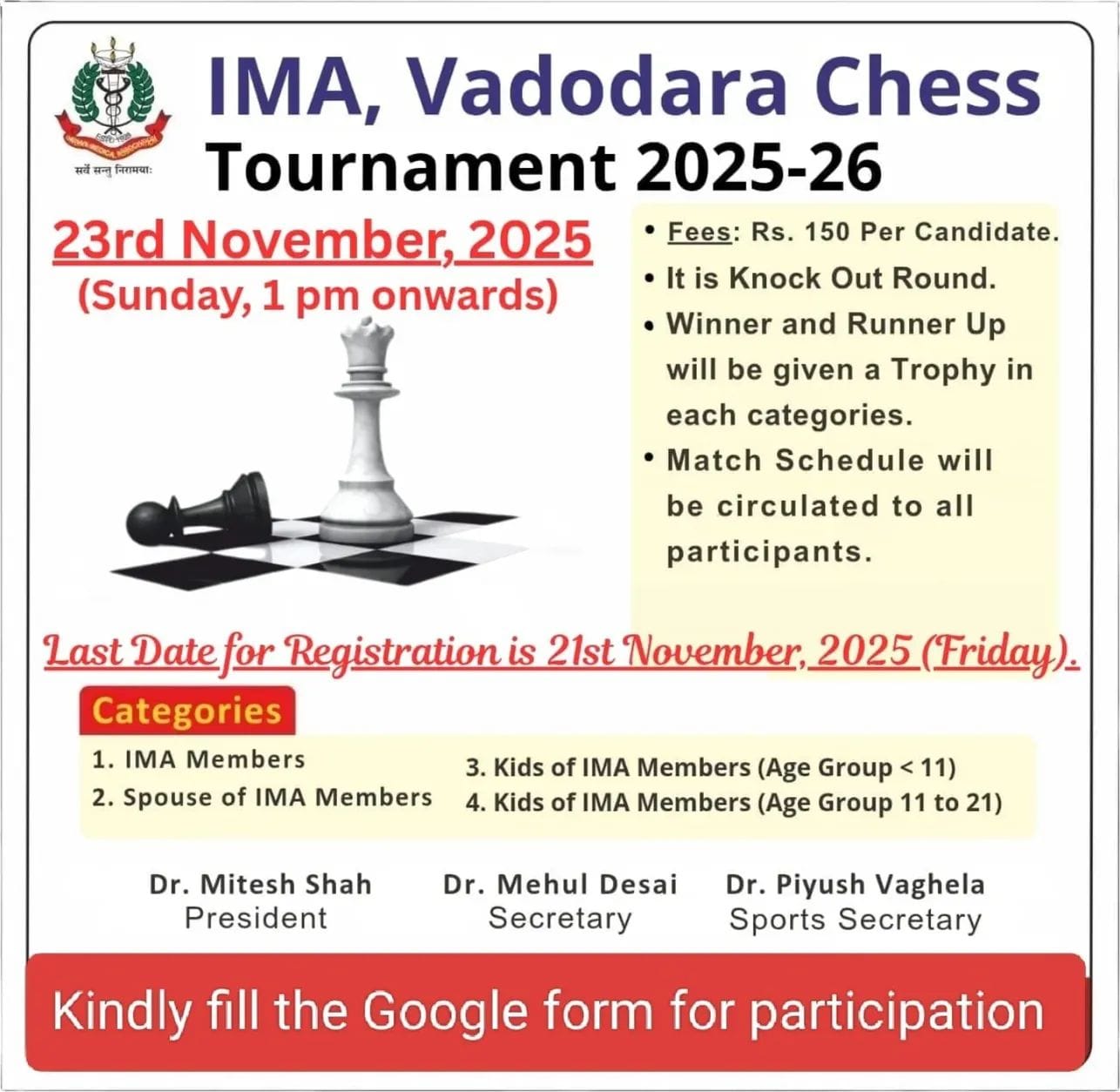 IMA, Vadodara Chess Tournament - 2024 Fees: Rs. 100 As Per Candidate. It Is Knock Out Round. Winner And Runner UP Will Be Given A Trophy In Each Categories. Match Schedule Will Be Circulated To All Participants In 1st Week Of Februrary.Read More...